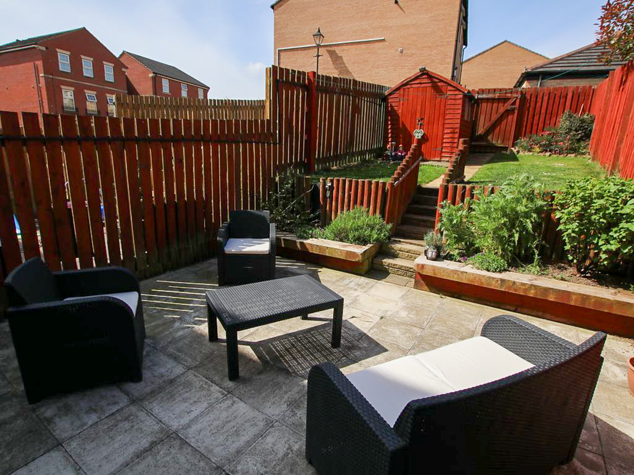 • Generous rear garden with a large two-level patio and lawns, ideal for tenants seeking outdoor space
