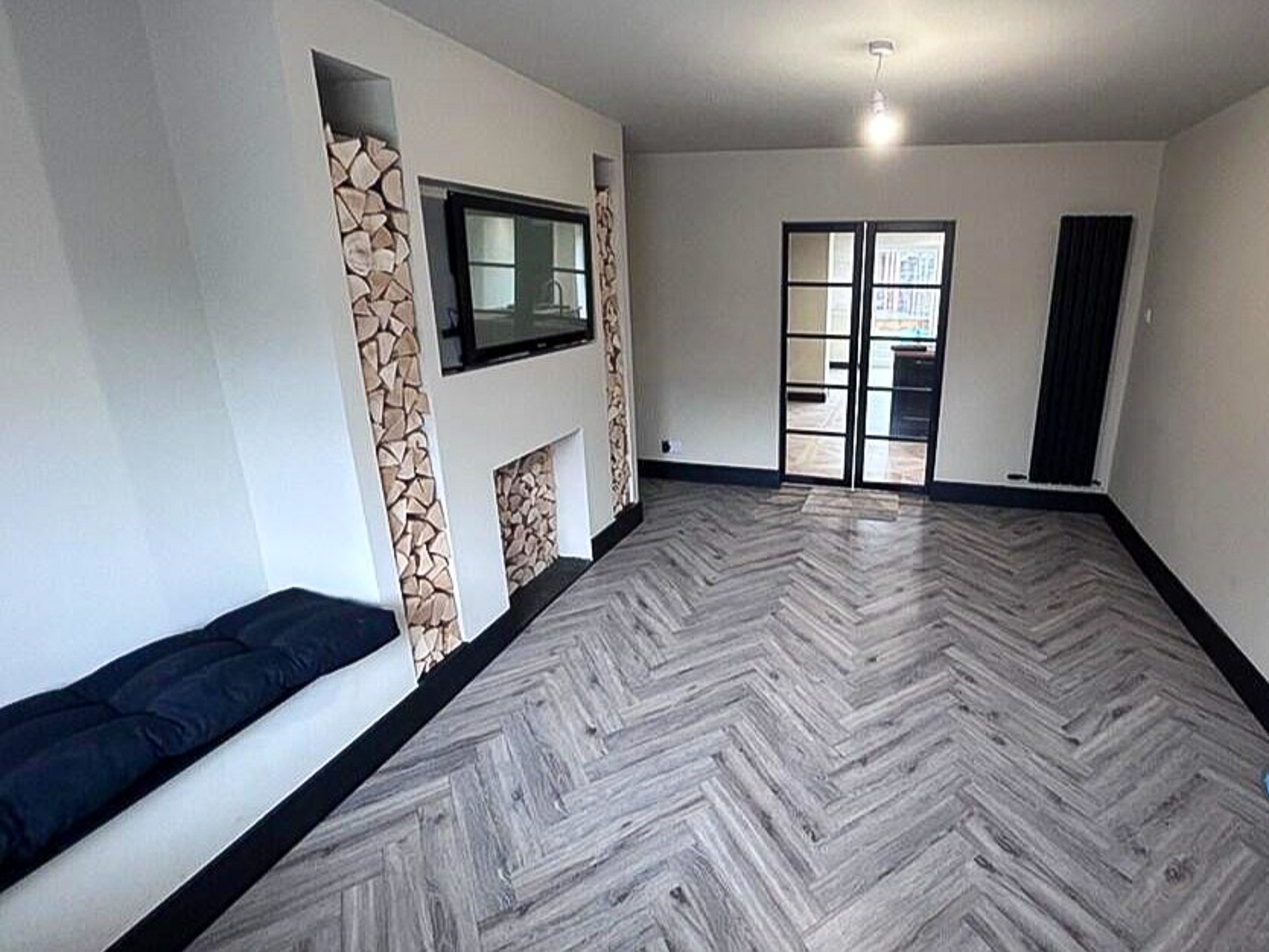 Separate living room with feature wall, media recess & log-style detailing